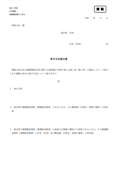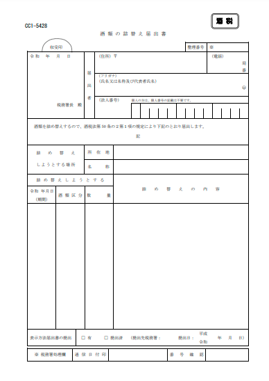 | 販売場など(酒類の製造場以外の場所) で酒類を詰め替えようとする場合 | 酒類の詰替え届出書 (CC1-5428) ![]() 表示方法届出書 (CC1-7101) ![]() | 詰め替えをする2日前までに |