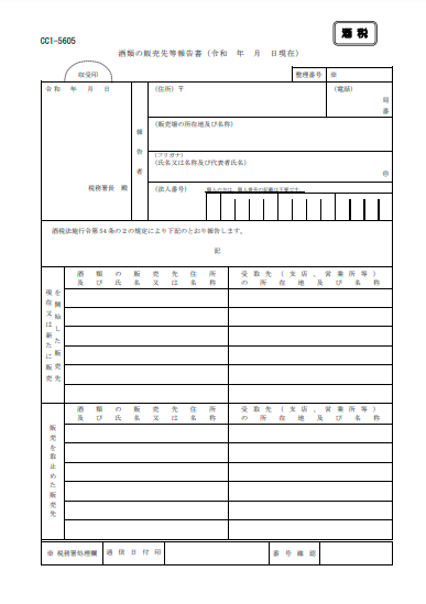 | 税務署長から、酒類の販売先 (酒場・料理店など)の住所氏名、 名称の報告を求められた場合 | 酒類の販売先等報告書 (CC1-5605) ![]() | 別途定める日までに |