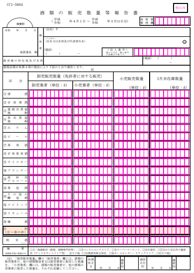 | 毎年度の酒類の品目別販売数量の合計数量 (4月1日~翌年3月31日まで) | 酒類の販売数量等報告書 (CCC1-5604) ![]() | 翌年度の4月30日まで |