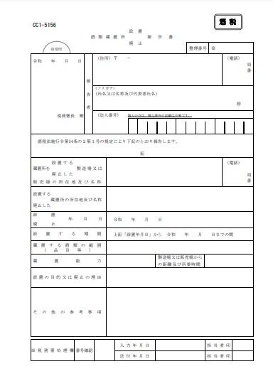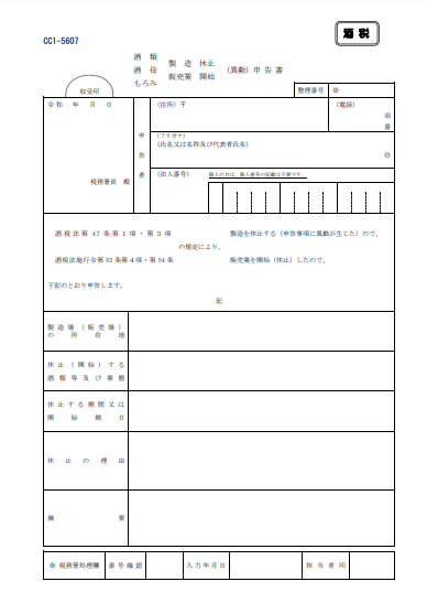 | 酒類の販売業を休止 または再開する場合 | 酒類販売業休止・開始(異動)申告書 (CC1-5607) ![]() | 販売場を休止・再開する時 できる限り早く |