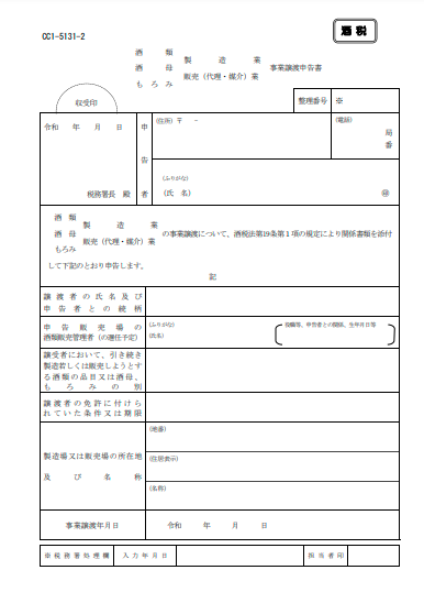 | 酒類販売業者に事業譲渡が 発生し、譲受人が引き続き 酒類販売業を継続する場合 | 酒類販売業事業譲渡申告書 (CC1-5131-2) ![]() | 販売場の所在地の所轄税務署長 | 事由が生じた後 できる限り早く |