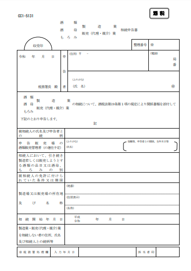 | 酒類販売業者に相続が発生し、相続人が引き続き酒類販売業を継続する場合 | 酒類販売業相続申告書 (CC1-5131) ![]() | 販売場の所在地の所轄税務署長 | 事由が生じた後 できる限り早く |