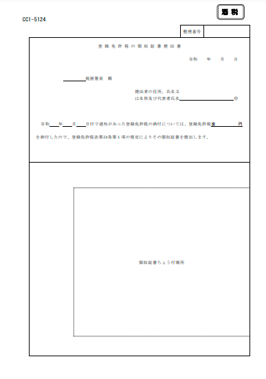 | 登録免許税の領収証書提出書 様式:CC1-5124 | 登録免許税を納付後、登録免許税の領収証書提出書に貼付して酒類販売業免許通知書の交付時に提出します ※免許申請時には出しません | ![]() |