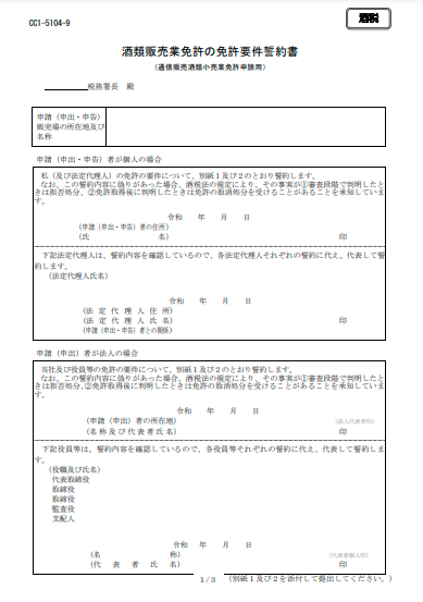 | 酒類販売業免許の免許要件誓約書 様式:CC1-5104-8 | 申請者、申請者の法定代理人、申請法人の役員および申請販売場の支配人について提出します ※申請者の法定代理人分または法人の役員分などについては代表者が代表して誓約できます。 | ![]() ![]() ![]() |