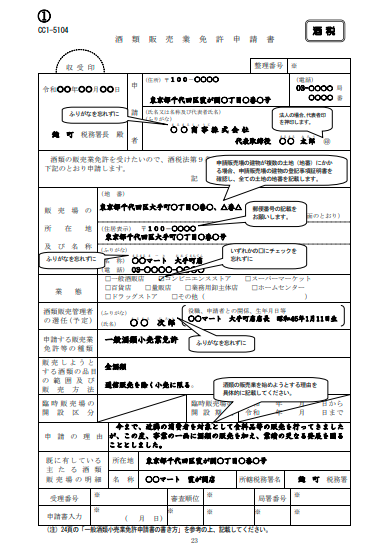 | 酒類販売業免許申請書 様式:CC1-5104 | 必要事項を記載します | ![]() |
