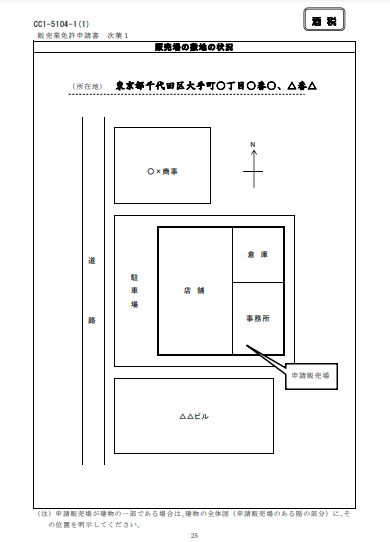 | 販売業免許申請書次葉1 「販売場の敷地の状況」 様式:CC1-5104-1(1) | 販売場が建物の一部の場合でも、建物の全体図に販売場の位置を示します。 | ![]() |