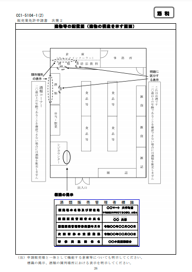 | 販売業免許申請書次葉2 「建物等の配置図」 様式:CC1-5104-1(2) | 倉庫部分、標識の掲示、酒類の陳列場所における表示について明示します。 | ![]() |