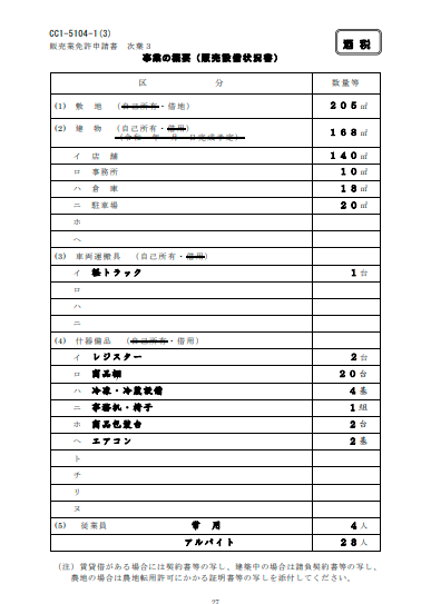 | 販売業免許申請書次葉3 「事業の概要」 様式:CC1-5104-1(3) | 店舗棟の広さ、什器備品などについて記載します | ![]() |