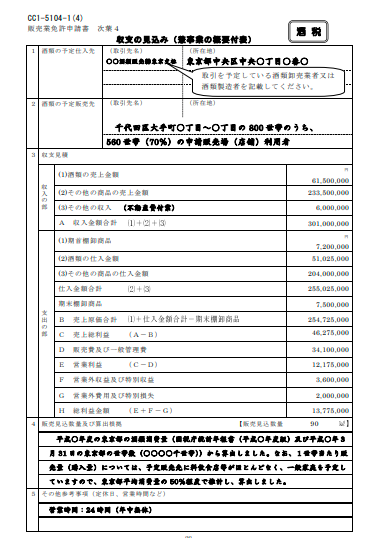 | 販売業免許申請書次葉4 「収支の見込み」 様式:CC1-5104-1(4) | 事業計画、規模にあった収支見込を作成します | ![]() |