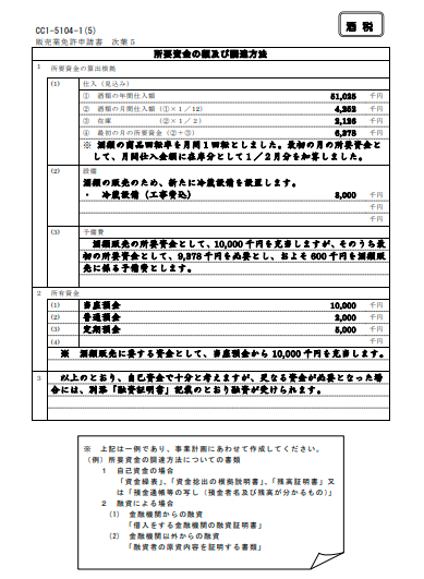 | 販売業免許申請書次葉5 「所要資金の額および調達方法」 様式:CC1-5104-1(5) | 自己資金の場合、資金捻出の根拠の説明書、 融資の場合、融資証明書を添付します | ![]() |