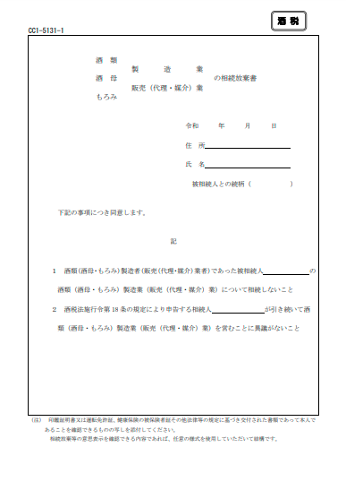 | 酒類・酒母・もろみ製造業販売業相続申告書 様式:CC1-5131 | ![]() 【注意点】 ・「酒母・もろみ製造所販売業相続申告書」の不要の文字は消します ・酒類販売業を相続するものが複数いる場合は連名で申告書を提出します ・申告販売場の種類販売管理者(の選任予定)の欄には申告販売場の酒類販売管理者として選任している・選任予定の人の氏名、役職などを記入します ・相続人において引き続き製造もしくは販売しようとする酒類の品目又は酒母、もろみの別の欄には引き続いて販売する酒類の品目を記入します ・被相続人の免許に付けられていた条件又は期限の欄には条件や期限があれば記入します ・製造場又は販売場の所在地及び名称の欄には土地の登記事項証明書に記載されている地番や市町村が定めた住居表示を記入します ・相続申告書の下蘭の製造業・販売業を相続しない者の住所、氏名及び相続人との続柄等の欄に書ききれない場合は下記の相続放棄書にその旨を記入します |