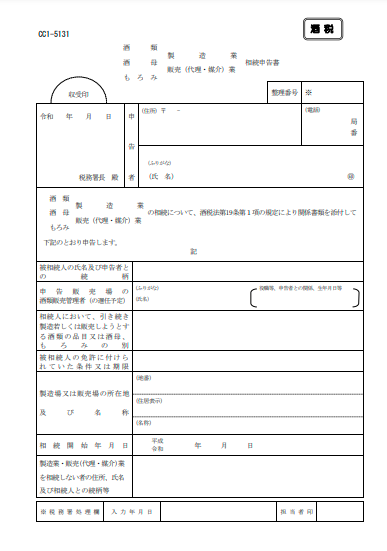 酒類販売業(製造者)が死亡して相続人がその酒類販売業を引き続いて行う場合には、相続人が酒類・酒母・もろみ製造業・販売業相続申告書で申告します。