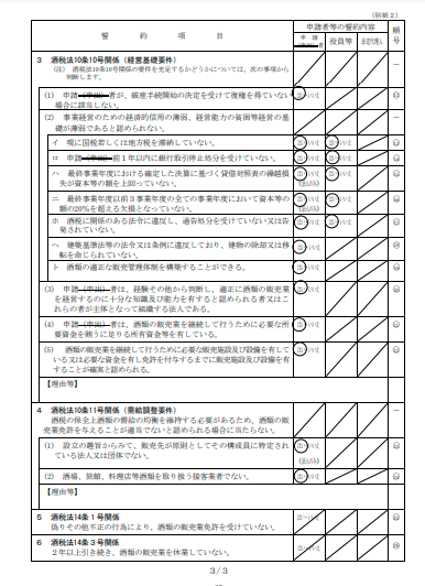- 酒類の免許、アルコール事業法の許可の取り消し処分を受けたことがある法人のその取消原因があった日以前1年以内にその法人の業務を執行する役員の場合は、取消処分を受けた日から3年を経過していること