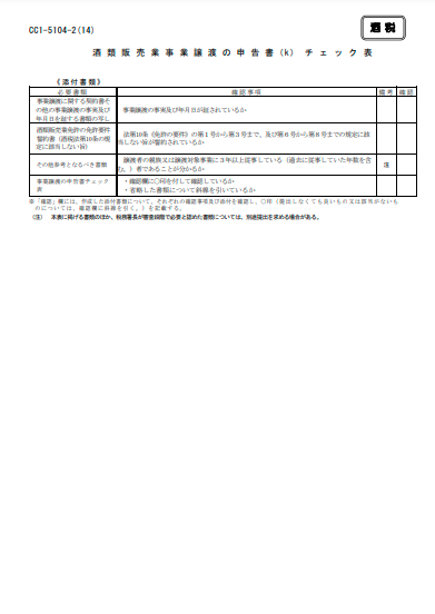 | その他税務署長が必要と認めた書類 | 【親族の場合】 ・申請者と譲渡人とのつながりが分かる書類 【親族以外の場合】 ・事業に3年以上従事していたのが分かる書類など (源泉徴収票、雇用契約書など) 【その他の添付書類】 ・申請者の履歴書 ・土地や販売場などの建物が賃貸借の場合は賃貸借契約書等の写しなど ・申請者の納税証明書 ・以前3年度分の財務諸表(個人の場合は源泉徴収など) ・土地などの登記事項証明書 ・当時の免許通知書のコピー(あればなお可) ※新規の申請の次葉以外の添付書類が必要になると考えて用意しておいとほうがいいでしょう |